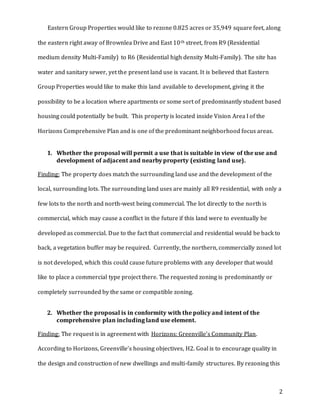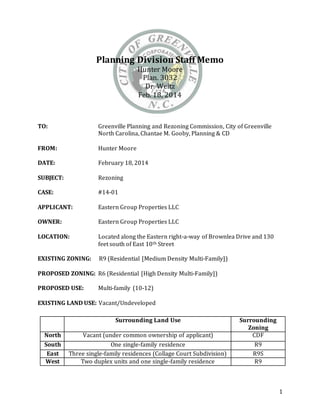 The document summarizes a staff memo regarding a rezoning case for a 0.825 acre vacant parcel from R9 (Residential Medium Density Multi-Family) to R6 (Residential High Density Multi-Family) to allow for construction of a 10-12 unit multi-family development. The staff finds that the proposed rezoning is consistent with the city's comprehensive plan and surrounding land uses, though notes a hill on the property may constrain development and the commercial zoning to the north could cause future conflicts. Notification was provided to surrounding property owners regarding the proposal. The staff believes the proposed rezoning is in higher compliance with the comprehensive plan and will allow for more diverse multi-family housing development on the site.