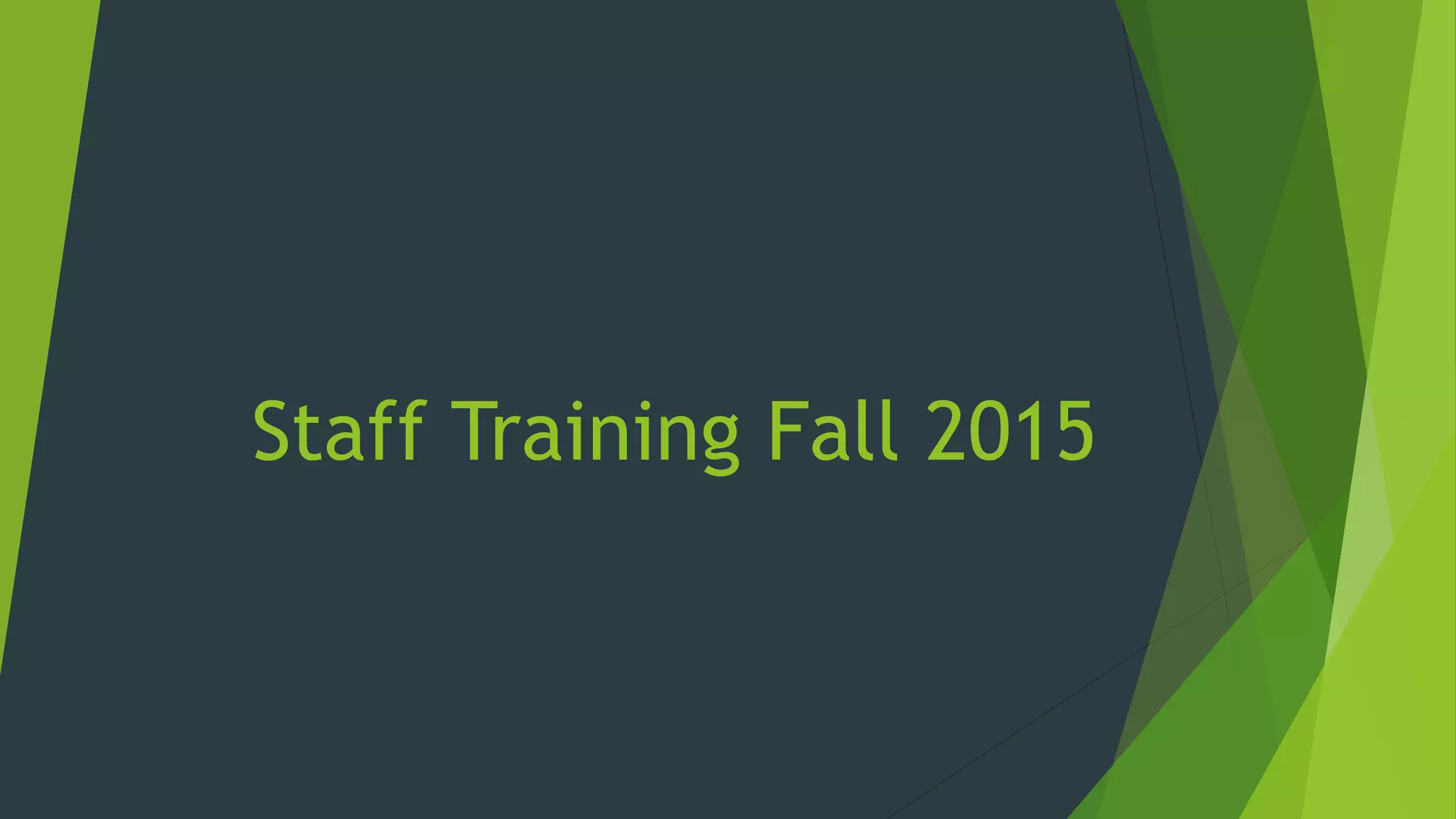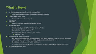 The document provides information for staff training at a campus recreation center in fall 2015. Key points include: fitness classes are now free with membership; instructors must check in participants using a tablet; a new director, Bob Holub, has been hired; and CPR/first aid certification classes will be offered on various dates for staff. Hours of operation are also outlined for the recreation center, aquatic center, and climbing wall during regular times and breaks.