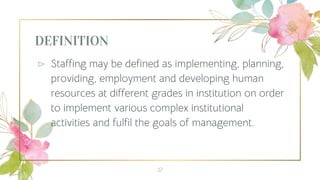 The document discusses staffing in healthcare organizations. It defines staffing and outlines its objectives, which include recruiting competent staff, retaining the right number of staff, and providing training. It also discusses patient classification systems, which group patients according to care needs to help determine staffing requirements. Nurse-patient ratios from different standards are presented for units like general wards, ICUs and ERs. The importance of effective scheduling is highlighted to ensure coverage, continuity of care, flexibility, stability and cost-effectiveness. Different scheduling methods like 10-hour shifts, 12-hour shifts and weekend scheduling alternatives are also outlined.