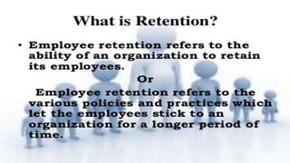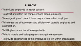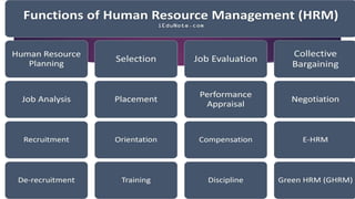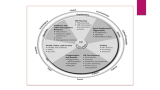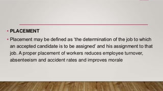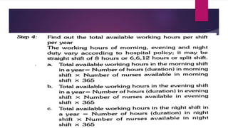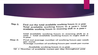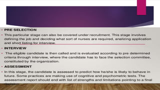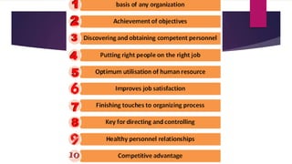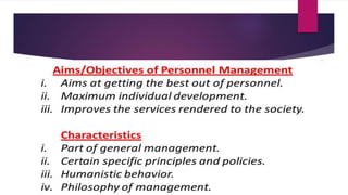 The document discusses human resource management and staffing in healthcare organizations. It provides definitions and introductions to personnel/human resource management, staffing, and safe staffing. It outlines the objectives, functions, principles, and determinants of healthcare success as they relate to human resource management. The document also discusses the meaning, philosophy, importance, components, and factors influencing staffing patterns. Various committees that have recommended nursing staffing norms and ratios are also summarized.