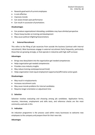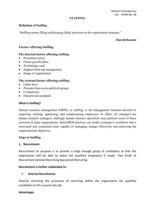 Staffing involves filling positions in an organization through recruitment, selection, induction, training, and placement of employees. It is affected by internal factors like promotion policies and external factors like labor laws. The steps in staffing are recruitment to source candidates, selection to evaluate candidates, induction to onboard new hires, training and development to educate employees, and placement to allocate employees to roles. Effective staffing helps organizations acquire and develop motivated workforces to achieve goals.