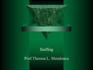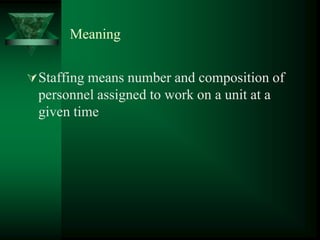 Staffing involves selecting, training, and retaining qualified personnel. It is a systematic process that aims to match employees' skills and knowledge to patient care needs. Key aspects of staffing include developing a staffing plan, determining staffing levels and ratios for different units, recruiting and selecting candidates, providing training and development opportunities, and conducting performance appraisals. The objectives are to ensure adequate staffing of critical care units while achieving appropriate nurse-patient ratios in other units and balancing staff needs with providing quality patient care.