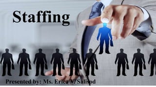 The document discusses the managerial function of staffing, emphasizing its importance in filling and keeping positions within an organization through a systematic process of recruitment, selection, and training. It outlines nine steps for effective recruitment and selection, along with the significance of training and performance appraisal in employee development. Additionally, it addresses employee relations, movements, and the need for a strategic reward system to enhance motivation and job satisfaction.