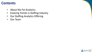Ma Foi Analytics is a data-centric insights advisory firm founded in 2012 that provides customized analytics solutions for the staffing industry. The organization leverages big data technology to build predictive models and establish key performance indicators, aiming to enhance business strategies and decision-making for their clients. Their team comprises experienced professionals from leading organizations, focused on delivering real-time, intuitive, and customizable analytics to meet the evolving demands of staffing firms.