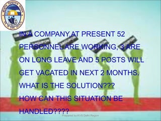 The document discusses staffing issues at a company. It states that currently 52 employees are working, 3 are on long leave, and 5 more positions will become vacant in the next 2 months. To address this situation, the document provides an overview of the staffing process. It discusses estimating manpower needs, recruitment and selection of candidates, placement and orientation of new hires, training and development, performance reviews, compensation, and ensuring positions remain filled. The key aspects of staffing outlined are finding qualified candidates to fill positions at the right time.
