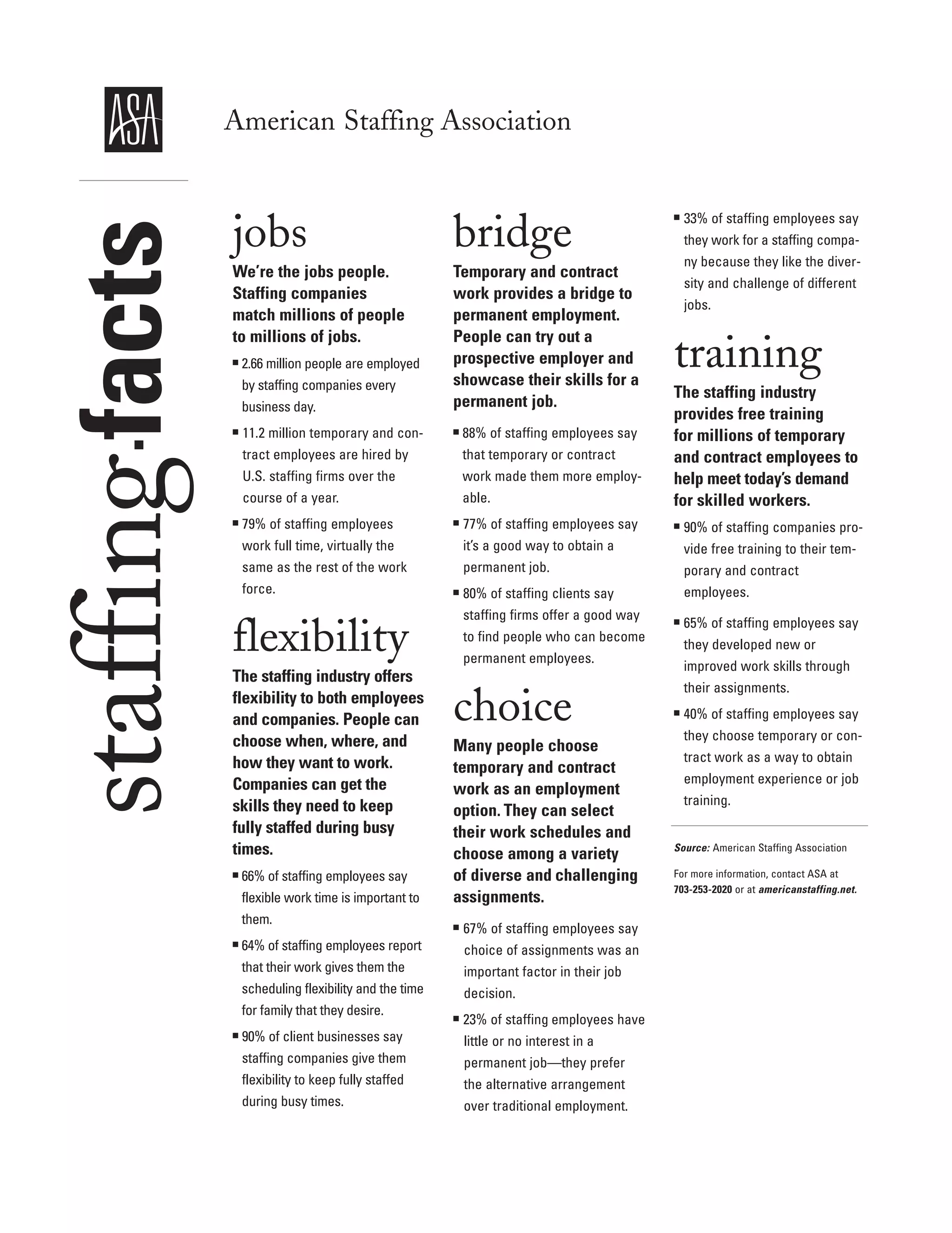 The American Staffing Association represents staffing companies that match millions of temporary workers with clients' employment needs. Staffing provides flexibility for both employees and companies while serving as a bridge to permanent employment for many workers. Temporary roles allow workers to gain experience, training, and skills while exploring different jobs and industries before potentially transitioning to permanent roles with client companies.