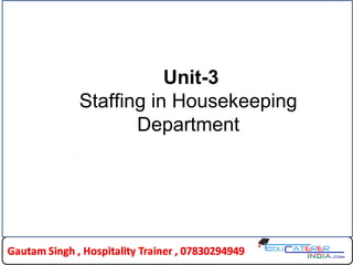 The document outlines the roles and responsibilities of various housekeeping personnel within a hotel setting, including the executive housekeeper, assistant housekeeper, floor supervisor, and room attendants. It details the functions of these roles in ensuring efficient operation and maintenance of cleanliness, safety, and guest satisfaction. Additionally, it covers the tasks of specialized staff such as linen room and uniform room supervisors, laundry managers, and horticulturists.