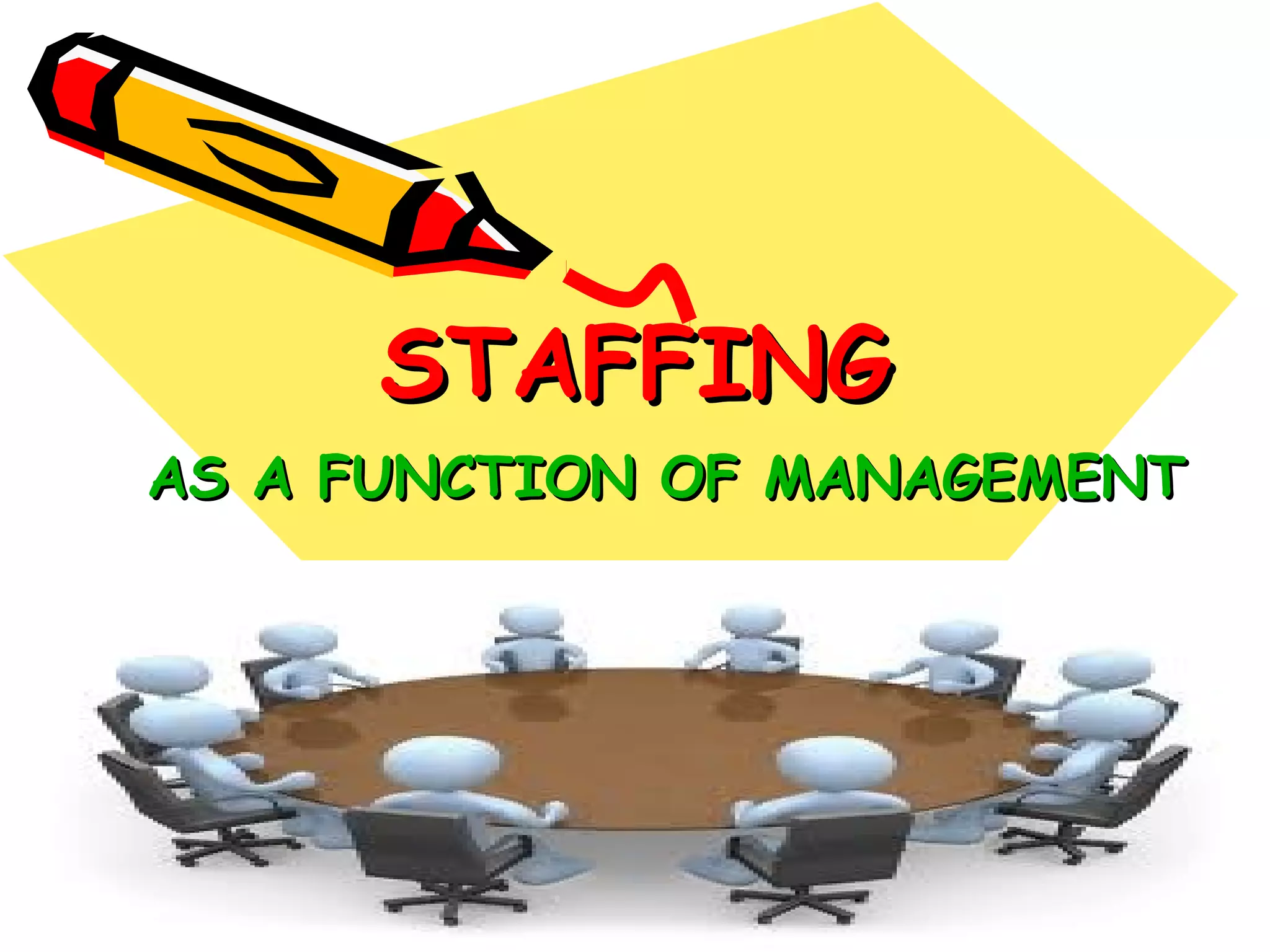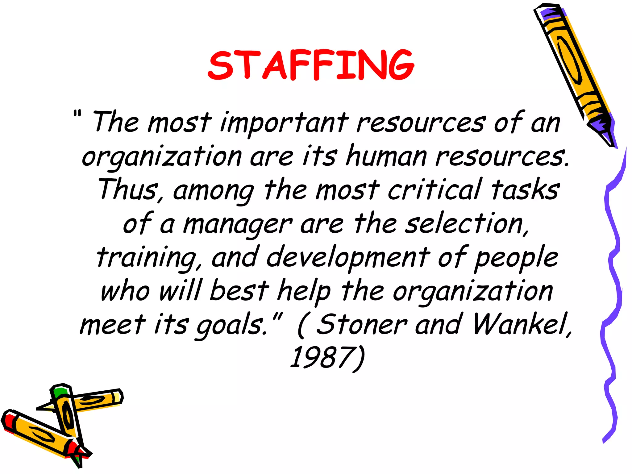 1. The document discusses the eight steps in the staffing process as a critical function of management. This includes human resource planning, recruitment, selection, induction and orientation, training and development, performance appraisal, transfers, and separations.