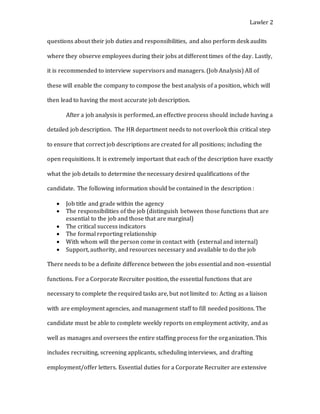 The document provides details on a recruiting and selection plan for hiring a Corporate Recruiter. It outlines the steps including performing a job analysis, creating an accurate job description, obtaining approvals to post the position, recruiting candidates through various sources, and screening applicants. The goal is to hire the most qualified candidate while following equal opportunity and affirmative action guidelines. Recruitment sources for the corporate recruiter position should target those with at least 5 years of experience, as the job requires a degree and experience. Issues that may arise include handling under or overqualified applicants as well as communicating with unsuccessful candidates.