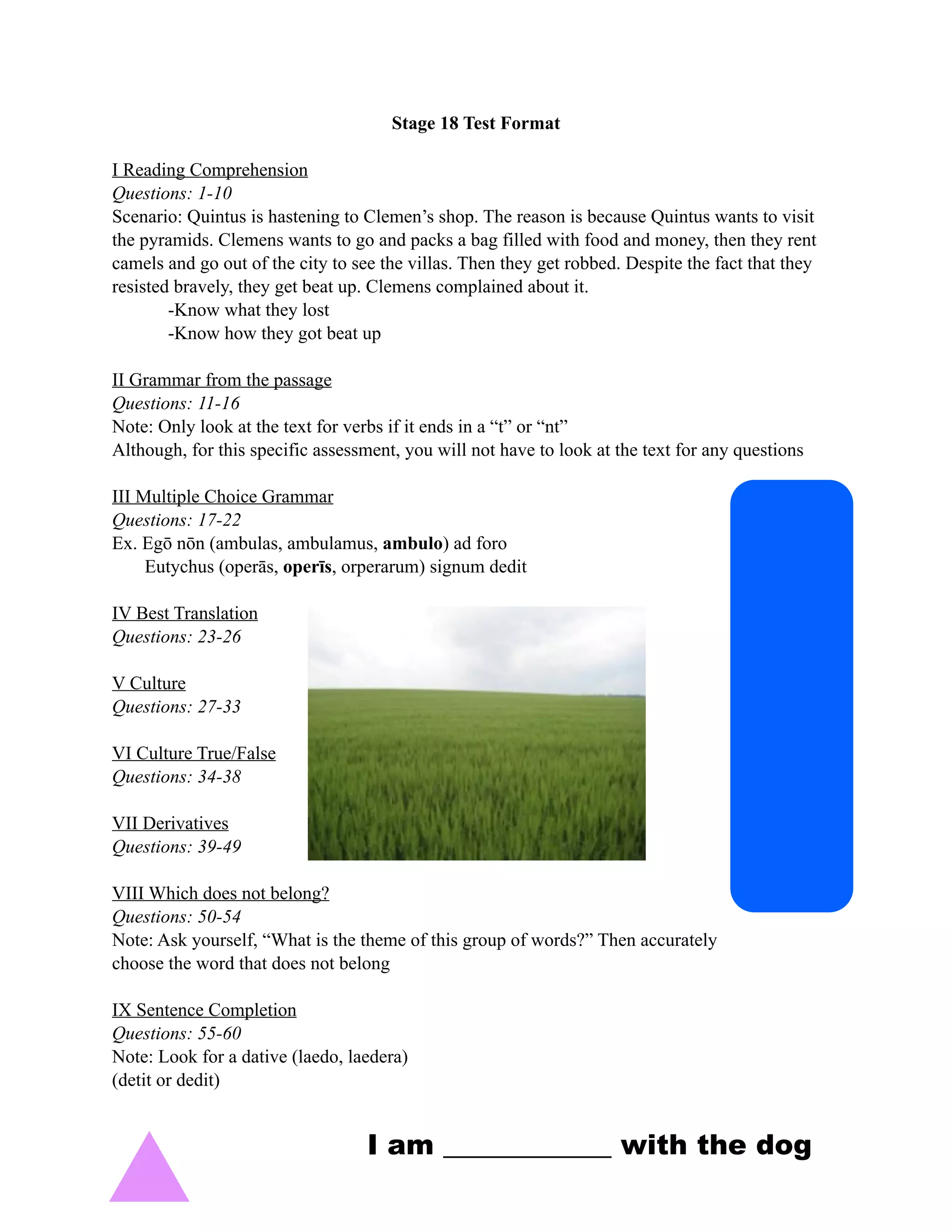 1) Reading Comprehension with a passage about Quintus and Clemens traveling to see pyramids and getting robbed