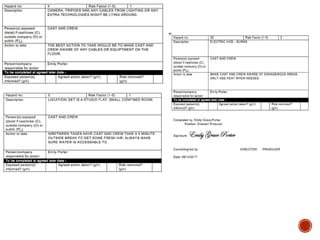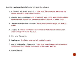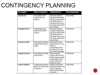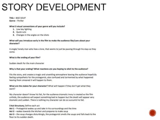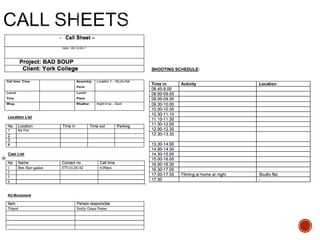 This document provides guidance and templates for planning a film production. It includes sections on visual planning with concepts boards, storyboarding and shot lists. Organizational planning covers casting, locations, schedules and forms. Soundtrack planning addresses diegetic sounds that would be heard by characters and non-diegetic sounds for the audience. Templates are provided for scene breakdowns, character details, equipment lists and credit tables. Students are instructed to customize the templates with details of their own short film and to continue adding details as planning progresses.