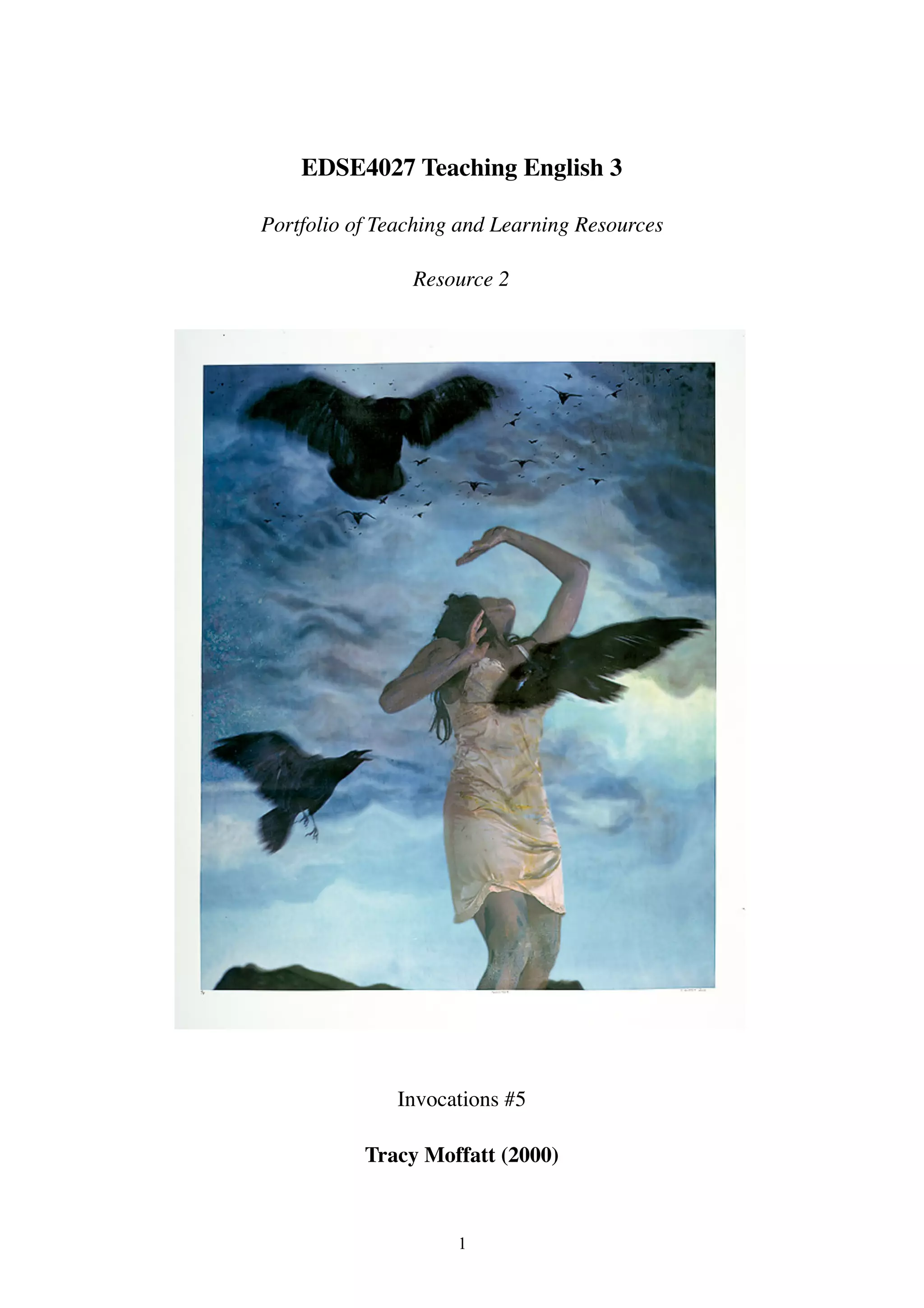 This document provides an analysis of the art work "Invocations #5" by Australian artist Tracey Moffatt. It discusses how the piece is part of Moffatt's 13-part series that draws from her subconscious to create surreal and nightmarish scenes. Invocations #5 depicts a vulnerable indigenous woman threatened by ravens, incorporating references to childhood stories and films. The artwork provokes questions about interpretation and could be used in an English class to encourage critical thinking about language and the creative process. Students would be tasked with recreating the piece based on their own dreams to appreciate diverse interpretations.