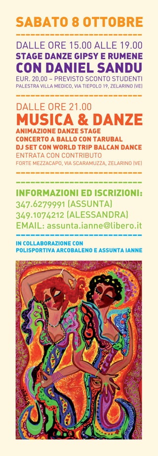 A dance event is taking place on October 8th in Zelarino, Italy. A gypsy and Romanian dance workshop will be held from 3-7pm at Villa Medico gym, costing 20 euros with student discounts available. An evening of music, dancing and a tarubal concert will follow from 9pm at Forte Mezzacapo, accessible with a contribution. Contact information is provided for Assunta Ianne and Alessandra to get more details or register. The event is organized in collaboration with Polisportiva Arcobaleno and Assunta Ianne.