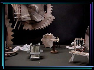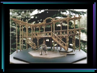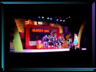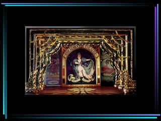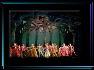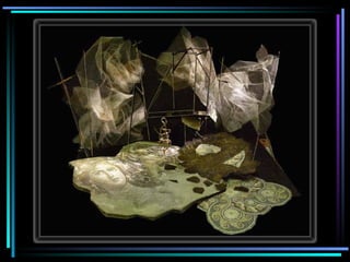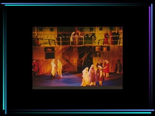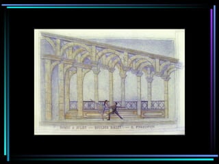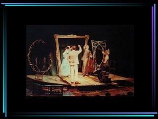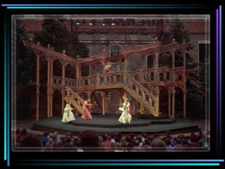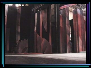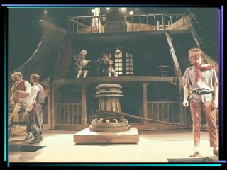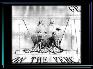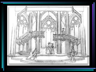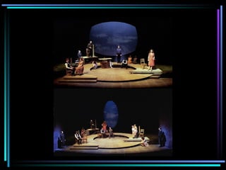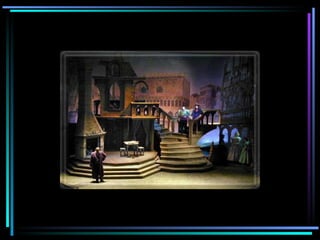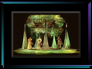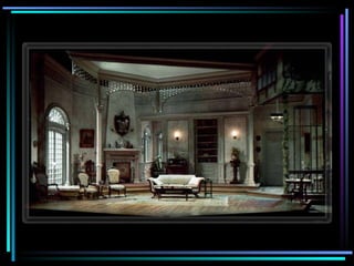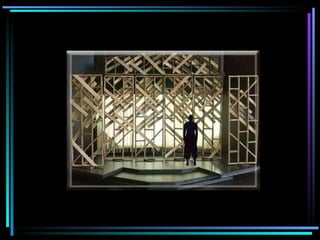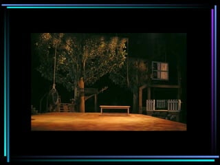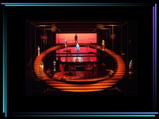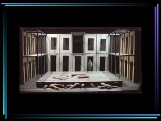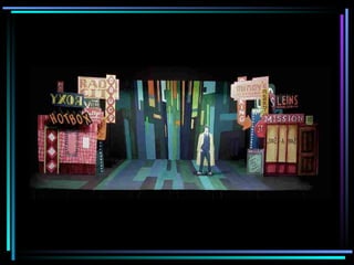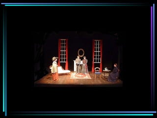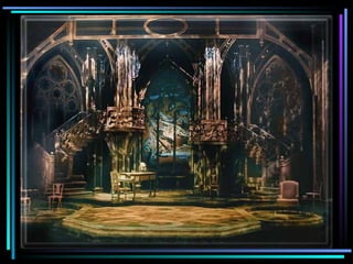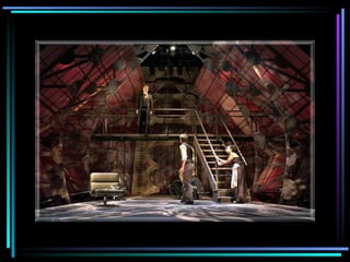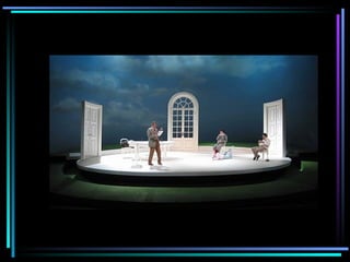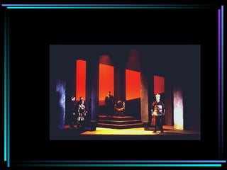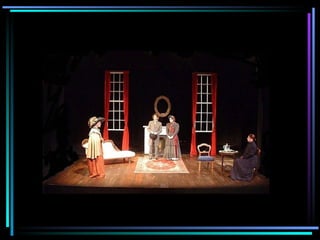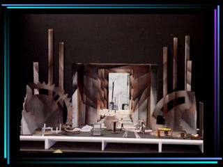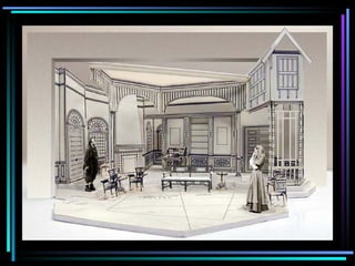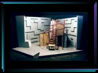 The set designer works closely with the director to interpret the play through the set. The set influences key elements like place, movement, sightlines, and symbolism. There are different types of sets including rostra and levels, box sets, swivel sets, and fixed sets. When designing a set, the designer must consider the period, place, movement opportunities, levels, and symbolic elements of the piece. The design brief includes research, samples, rough and final designs, and a bibliography.