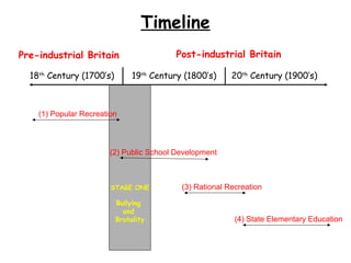 STAGE ONE Bullying and Brutality 18th Century (1700’s)19th Century (1800’s) 20th Century (1900’s) Pre-industrial Britain Post-industrial Britain (1) Popular Recreation (2) Public School Development (3) Rational Recreation (4) State Elementary Education Timeline