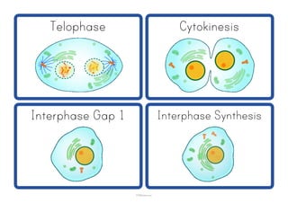This document describes the stages of mitosis and interphase. It lists the stages of mitosis as prophase, prometaphase, metaphase, anaphase, telophase and cytokinesis. It also lists the three stages of interphase as gap 1, synthesis, and gap 2. The document is from STEMsheets.com.