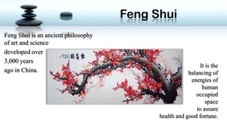 Feng shui, an ancient Chinese practice, focuses on balancing energies within spaces to promote health and fortune. The document outlines three feng shui approaches—compass, intuitive, and environmental—and details the bagua map, which associates different areas of a home with life situations. It provides practical staging tips for various rooms to enhance positive energy flow, including color choices and furniture arrangements.