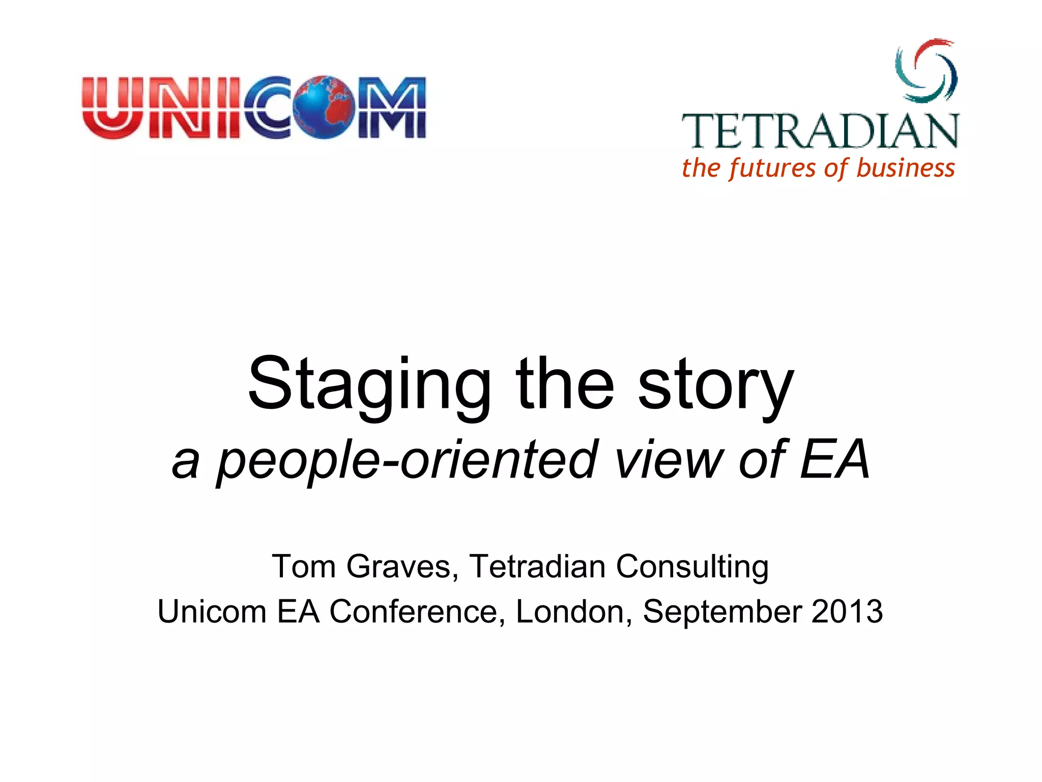 The document discusses viewing enterprise architecture through a "people-oriented" lens that focuses on stories and narratives. It argues that the enterprise itself can be viewed as an overarching story comprised of smaller stories or processes. These stories take place on a "stage" defined by the technology infrastructure and context. Viewing enterprise architecture through this narrative or story-based framework helps highlight the role of people as actors within the enterprise.