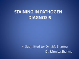 1. Staining techniques are used to increase visibility and provide extra information about cells and tissues in pathogen diagnosis. Stains are chemical substances that bind to specific components of cells.