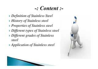 The document provides a comprehensive overview of stainless steel, detailing its properties, history, and various types including austenitic, martensitic, ferritic, duplex, and precipitation hardening. It highlights the composition, applications, and characteristics of each type, emphasizing their corrosion resistance and mechanical properties. Additionally, it outlines common applications across various industries, such as automotive, architecture, and medical fields.