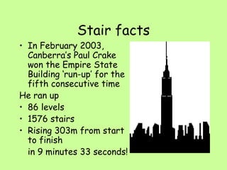 3) Various stair types include straight, quarter-turn, spiral, and others. Landings are required between flights to break up long runs of stairs.