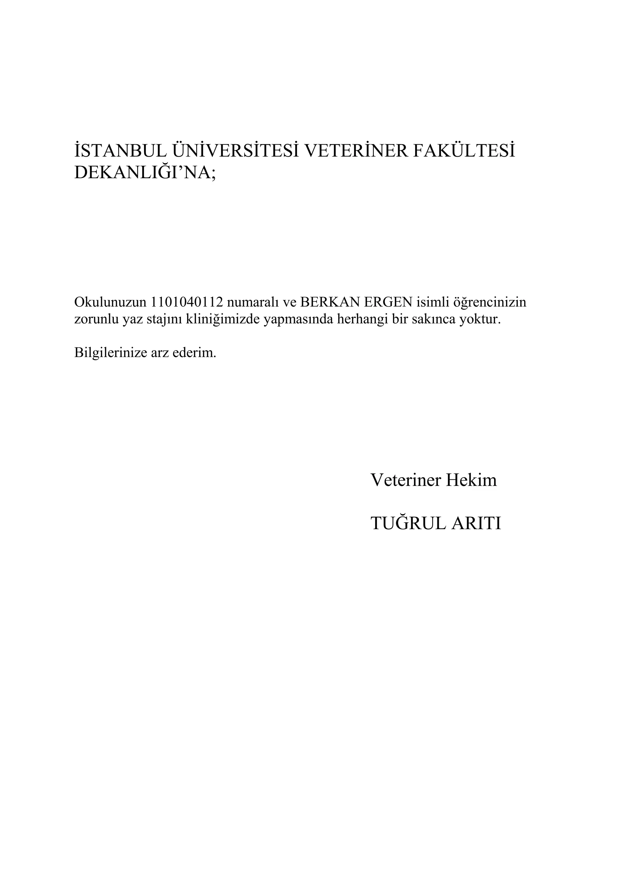 Staj dilekçe 1. İSTANBUL ÜNİVERSİTESİ VETERİNER FAKÜLTESİ