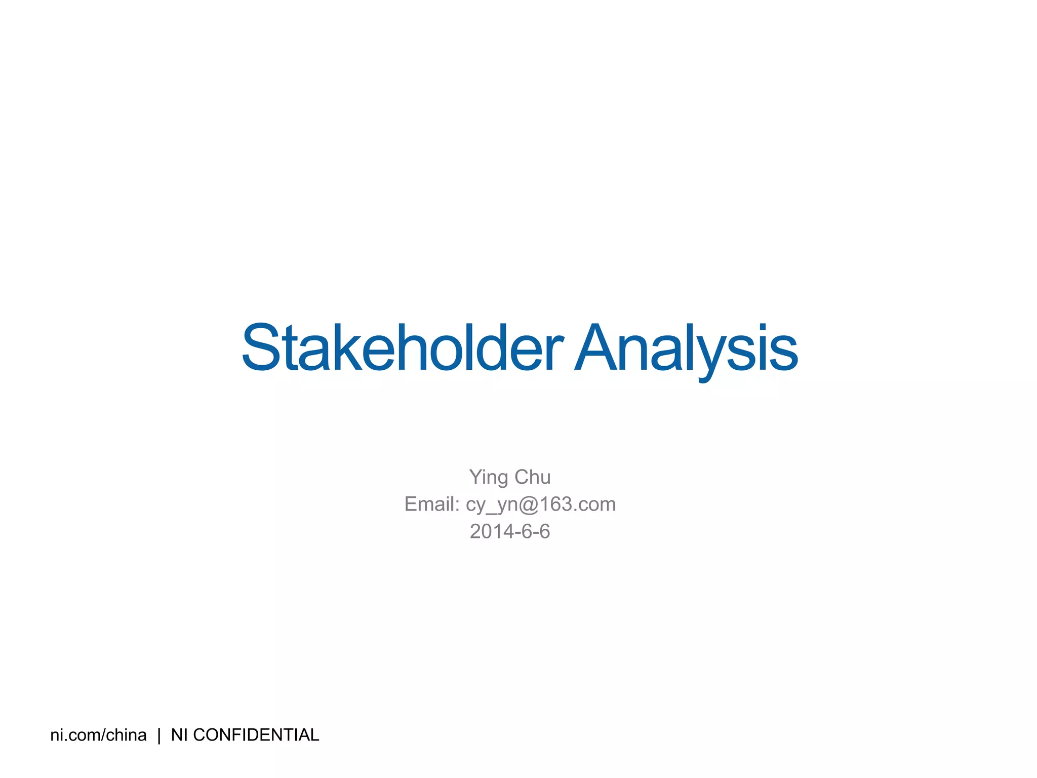 This document outlines a stakeholder analysis process that includes identifying stakeholders, analyzing them, creating a management plan, and engaging with stakeholders. It defines a stakeholder as anyone affected by or able to influence an organization, strategy, or project. The document recommends identifying stakeholders through mind mapping and categorization, then analyzing their needs, interests, and potential impact. It suggests choosing engagement approaches tailored to each stakeholder and developing a communication plan that addresses information needs, frequency of updates, and communication channels for all stakeholders. The goal is to understand stakeholders and manage them in a way that promotes project success.