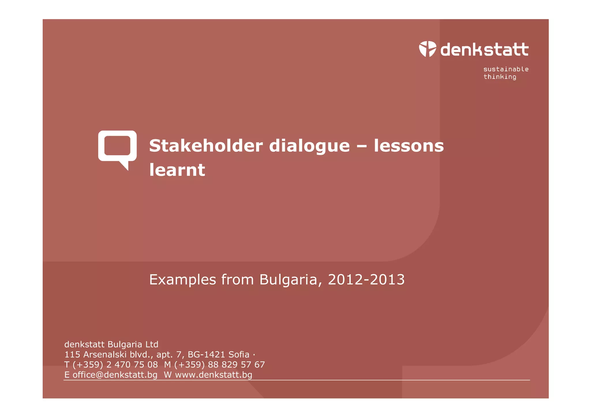 This document discusses lessons learned from stakeholder engagement efforts related to mining projects in Bulgaria between 2012-2013. It describes some of the challenges faced, including lack of trust in the community, fear of speaking out, and an expectation of receiving sponsorships. The engagement process required patience and persistence to overcome initial problems like misinformation, an unreceptive post-communist society, and a lack of understanding of sustainability concepts. The goal was to establish an open dialogue using principles of stakeholder inclusion to obtain support for investment and operation of a gold mine.