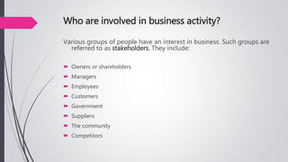 The document discusses stakeholders in business. It defines stakeholders as individuals or groups that are affected by or can affect a business's activities. It identifies common internal stakeholders as owners, managers, and employees, and external stakeholders as customers, suppliers, government, and the community. The document notes that stakeholders can have varying interests and levels of power over a business, and that balancing these interests is important for business success and social responsibility.