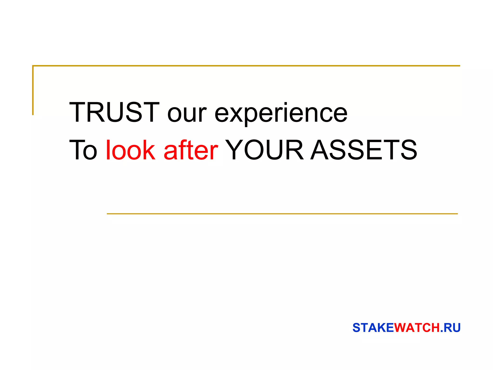 Документ обсуждает влияние мирового финансового кризиса 2008 года на российскую экономику и компании, подчеркивая риски для инвесторов в условиях слабого корпоративного управления и недостатка прозрачности. Он предлагает решения для улучшения корпоративного контроля и монетарного надзора за активами, включая аутсорсинг услуг специализированных компаний, таких как 'Stakewatch'. Основное внимание уделяется необходимости эффективной защиты интересов инвесторов и реализации комплексного подхода к антикризисному управлению.