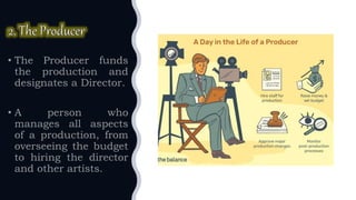 This document outlines the roles and responsibilities of the various people involved in a theatrical production. It discusses the director, actors, stage manager, assistant stage manager, running crew, production manager, set designer, construction crew, decorating crew, technical director, lighting crew, sound crew, props coordinator, costume coordinator, makeup coordinator, house manager, publicity coordinator, and box office staff. It explains what each role entails and how they work together to plan, rehearse, and present a theatrical performance.
