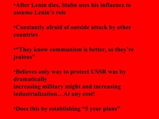 After Lenin's death, Stalin consolidated his power in the Soviet Union and instituted extreme policies of industrialization and collectivization through five-year plans. He forced farmers to join collective farms, confiscated land from wealthier farmers, and exiled many to labor camps. Stalin established a totalitarian dictatorship, purging political opponents through executions and imprisonments. His repressive policies resulted in millions of deaths but also transformed the USSR into a global superpower.