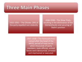 The document outlines the Soviet Union's political purges between 1936 and 1938, detailing the show trials, mass terror events like the Yezhovshchina, and the elimination of political rivals, which included millions of arrests and executions. It discusses the roles of various political figures and the mechanisms of terror used by the NKVD to establish Stalin's control. Interpretations of the purges suggest a lack of a master plan from Stalin, as they were driven by his personality and a desire to eliminate potential rivals.