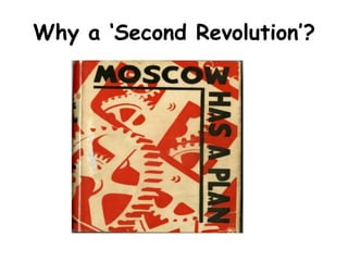 The document discusses Stalin's "Second Revolution" in the Soviet Union in the 1930s. It aimed to 1) build socialism more fully, 2) defend socialism against external and internal threats, and 3) match Lenin's achievements. Stalin's revolution involved economic modernization through industrialization and collectivization, social transformation to create "Homo Sovieticus," and the establishment of a totalitarian one-party state and cult of personality. Key aspects included collectivization of agriculture into kolkhozes, industrialization through five-year plans, and the use of terror through the Great Purge.