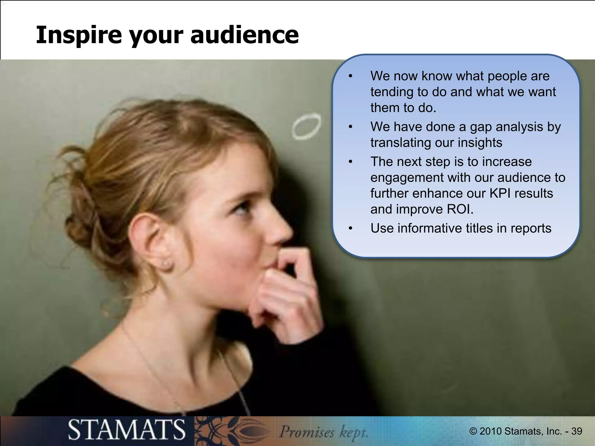 This document summarizes a presentation on using web analytics to improve performance. It discusses defining goals and key metrics to track, setting up funnels in analytics tools, and making data actionable by addressing problems and focusing efforts on improving high-value traffic and conversions. Regular reporting and A/B testing were recommended to monitor progress towards goals and continuously optimize the site. People, processes, and tools need to work together, with a focus on progress over perfection through ongoing analysis and improvement.