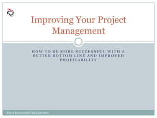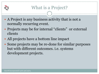 This document discusses how to improve project management and ensure project success. It defines a project as a non-recurring business activity that can impact profits. Projects often fail due to poor planning, lack of clear goals, insufficient management support, or not using project management best practices. To ensure success, it is important to create a detailed project plan signed off by all stakeholders, make sure goals are understood the same by everyone, and use proper project management techniques. The company Enov8 provides project management training, planning, execution support, and tools to evaluate and fix processes to help organizations improve their project success rates.