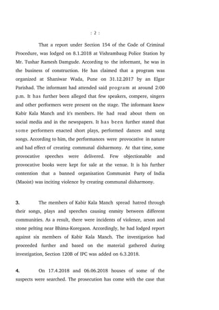 2. It outlines the background of the case, including the police complaint filed in 2018 regarding the Elgar Parishad meeting and subsequent violence, and the expanding scope of the investigation.