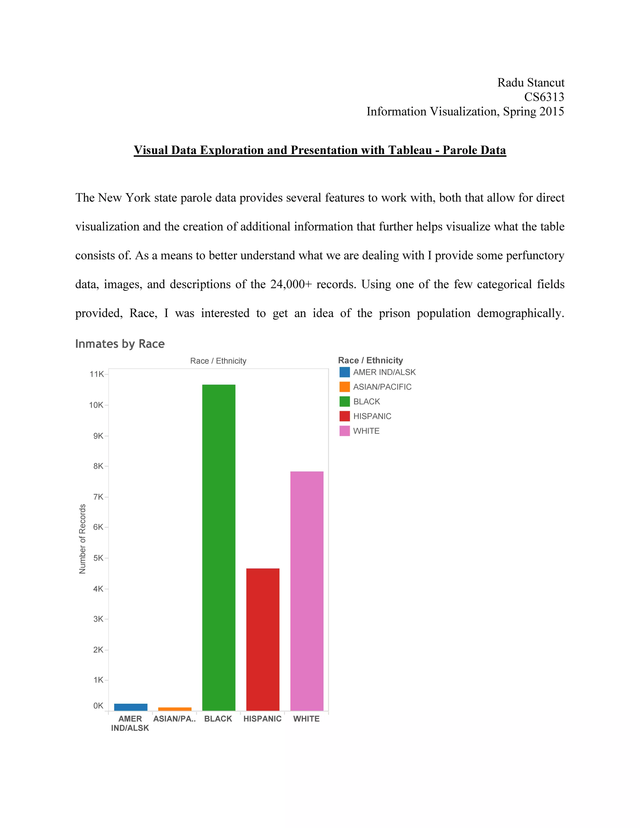 The document analyzes New York State parole data with a focus on race demographics among inmates and parole decisions. It reveals that over half of inmates are denied parole and highlights potential racial disparities, with higher incarceration rates for black individuals compared to their white counterparts. Further research is recommended to explore the impacts of crime types on prison time and parole outcomes, as current data lacks details on offenses committed.