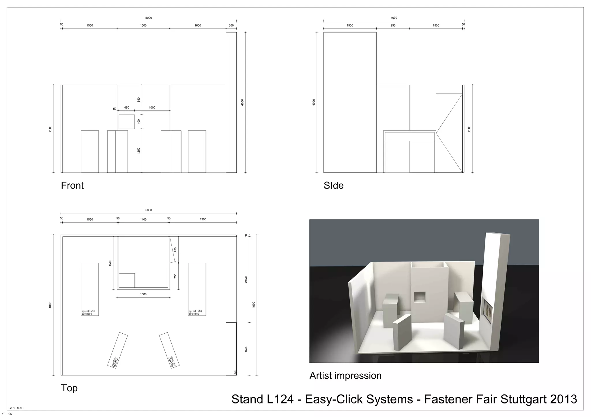 The document appears to be a diagram showing dimensions and measurements of a stand structure. It includes labels and measurements for different sides and parts of the stand structure, including the front, side, and top views, with measurements in millimeters ranging from 50 to 5000. The diagram also includes labels for parts of the stand like the front, side, and an artist impression label.