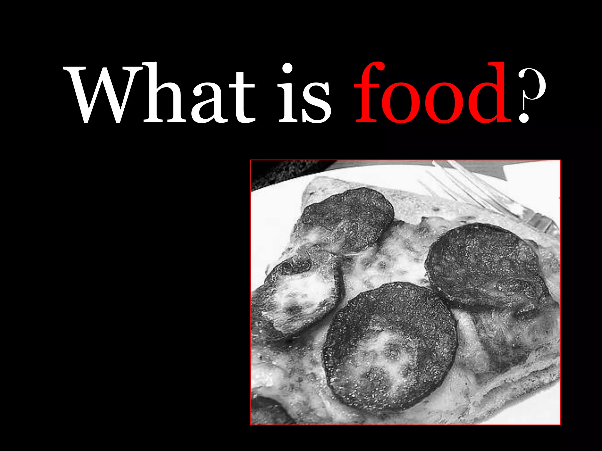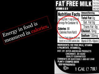 Food is defined scientifically as matter and energy that provides living things with the materials and fuel they need to live, grow, and reproduce. Matter provides the physical building blocks and energy powers all of the functions within cells and organisms. Living things get energy and matter by consuming other organisms within a food web - producers like plants get energy from the sun through photosynthesis, consumers obtain energy by eating other organisms, and decomposers get energy from breaking down waste and dead matter. All organisms depend on each other for the transfer of energy and matter throughout the food web.
