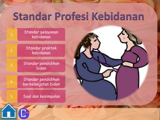profesinya yaitu standar profesi bidan. Ada 4 standar pokok :