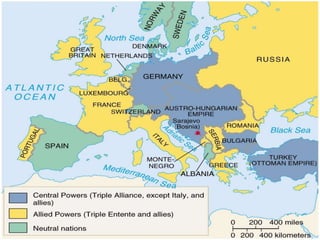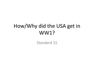 The USA entered WWI in 1917 for several reasons: German unrestricted submarine warfare sank American merchant ships and violated free trade; the Zimmerman Telegram proposed a German alliance with Mexico against the US; and President Wilson hoped to make the world safe for democracy. When the US joined the Allies, it provided troops and supplies that helped tip the balance in their favor. The war had significant impacts on the US such as women entering the workforce, the passage of women's suffrage and prohibition, and the Great Migration of African Americans to northern cities. The Treaty of Versailles after WWI was harsh on Germany and contributed to the start of WWII.