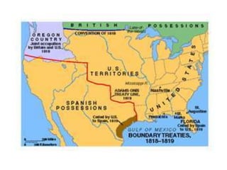 The document summarizes key events in the early growth and development of the United States after gaining independence, including the establishment of systems for territories to become states, Jefferson's presidency and the Louisiana Purchase, exploration of Lewis and Clark, the War of 1812 and Treaty of Ghent, and Monroe's presidency and the Monroe Doctrine asserting American influence over European powers in the Americas.