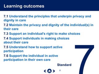 This document discusses the principles of privacy and dignity in care. It outlines several key learning outcomes related to maintaining an individual's privacy and dignity, including supporting their rights to make choices about their own care. The document defines privacy and dignity, and provides examples of how to support both in a care setting. It also discusses the importance of involving individuals in decisions about their care, assessing risks, and supporting active participation and self-care.