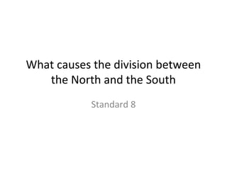 The document discusses several key factors that contributed to the growing division between the North and South in the United States, including the expansion of slavery in the South due to the cotton gin and demand for land versus the growth of industry without slave labor in the North. It also discusses abolitionist movements, slave rebellions, the Missouri Compromise, nullification crisis, and the Compromise of 1850 as major events that exacerbated sectional tensions over the issue of slavery.