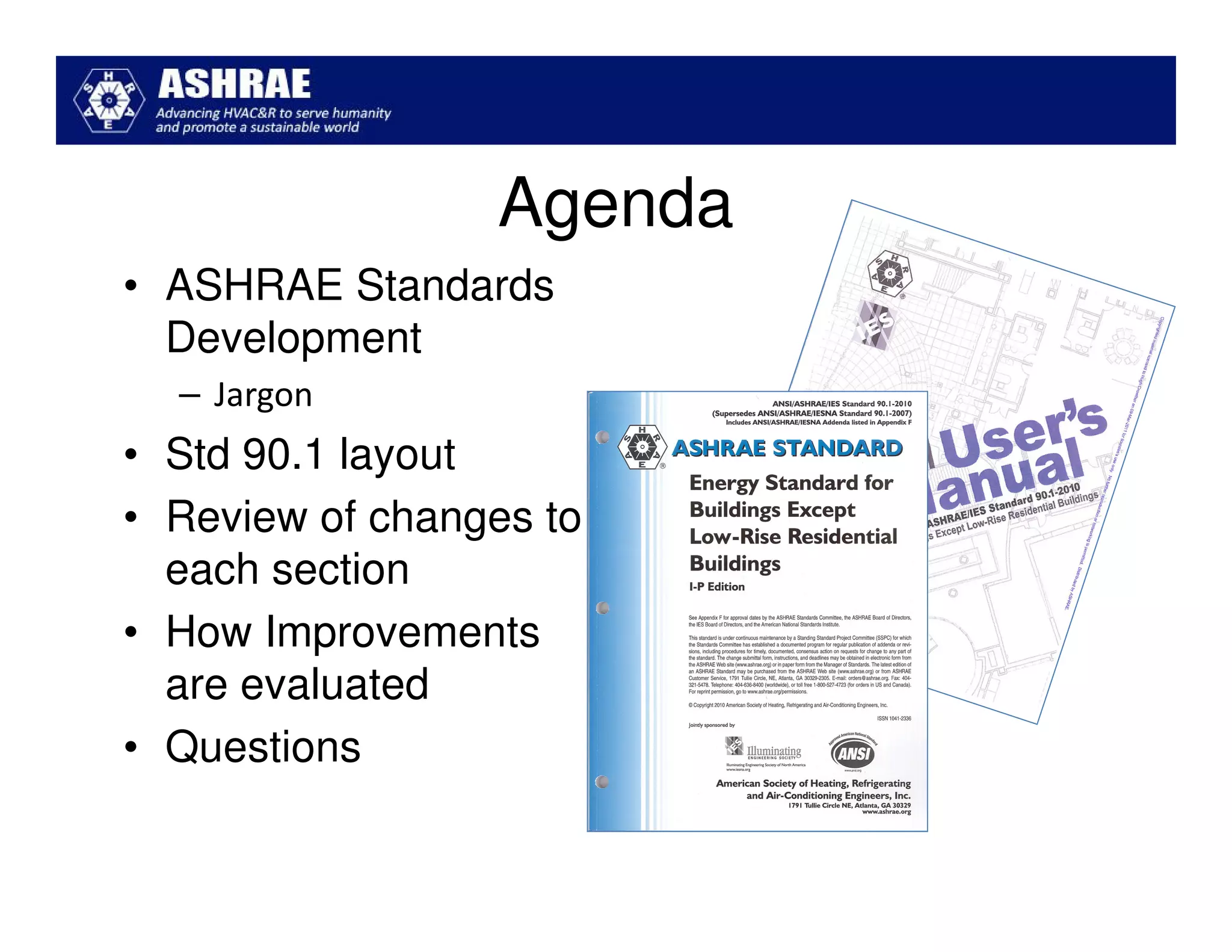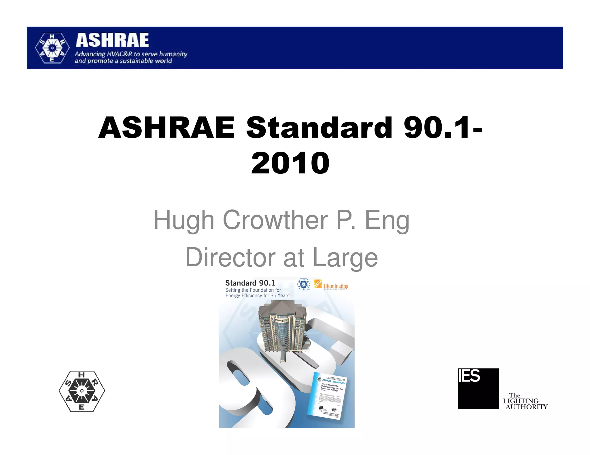 ASHRAE Standard 90.1-2010 made significant improvements in energy efficiency over the 2004 version. It expanded the scope to include process loads and established new requirements in key areas like building envelopes, HVAC systems, and lighting. The standard evaluates savings based on both site energy and energy cost reductions. Compliance can be met through prescriptive requirements or through a trade-off option. The presentation reviewed many of the changes introduced in key sections between the 2007 and 2010 versions.