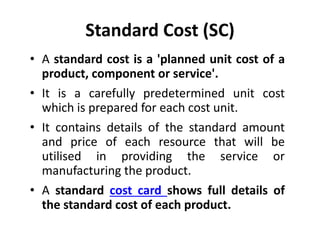 Standard costing involves establishing predetermined estimates of the costs of products or services, collecting actual costs, and comparing actual costs to the estimates. Standards are set for materials, labor, overhead, and selling prices/margins based on historical data, task analysis, and production process analysis. Material and labor standards consider factors like supplier prices, wage rates, and efficiency levels. Overhead standards may be based on a rate per labor hour. Comparing actuals to standards highlights variances that need management attention to control costs.