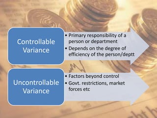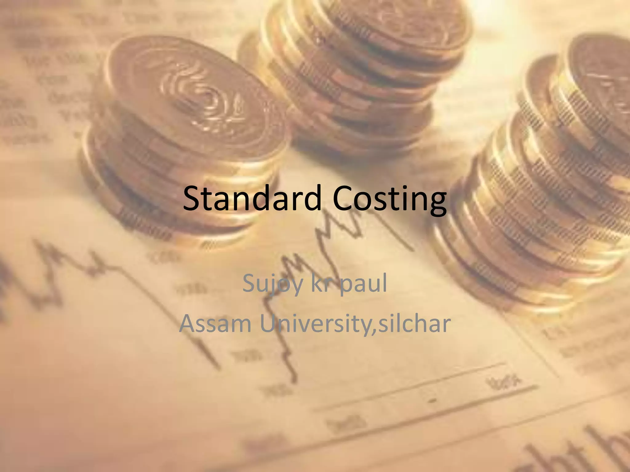 Standard costing is a specialized costing technique used for cost control that establishes predetermined costs known as standards that are used as benchmarks to measure performance and control costs. Variances between actual and standard costs are analyzed to identify reasons for differences and assign responsibility so corrective measures can be taken. Standard costing is useful for decision making, production planning, policy formulation, and proper budgeting as it provides feedback on performance.