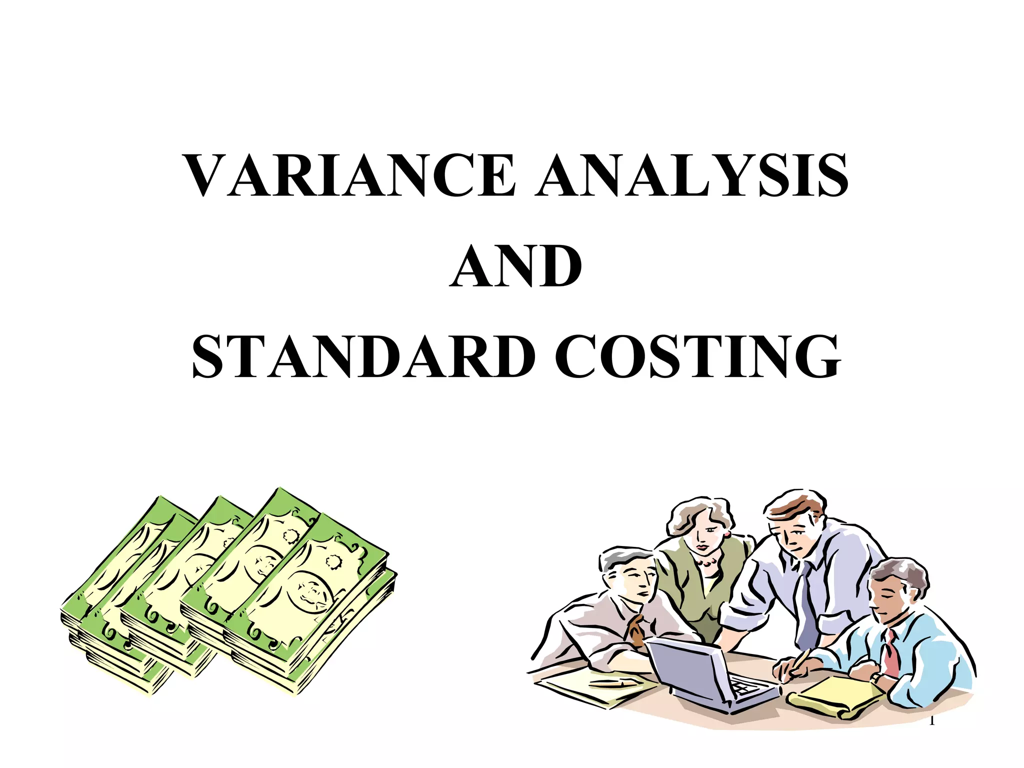 Standard costing involves setting predetermined expected costs for cost components like direct materials, direct labor, and factory overhead. Variances are calculated as the difference between actual and standard costs. This includes direct material, direct labor, and factory overhead variances. The direct material variance has a price and usage component. The factory overhead variance separates variable from fixed costs, with the controllable variance measuring variable cost efficiency and volume variance measuring fixed cost utilization.