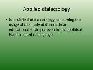 Applied dialectology concerns the study and use of dialects in educational settings and issues related to language and society. There is an ongoing debate about what constitutes American English in different communities and how standard English can be effectively taught in schools. Approaches to teaching standard English include replacing vernacular dialects, balancing standard English and dialects depending on the situation, and promoting dialect rights by addressing ethnocentrism and prejudice. Successful teaching of standard English depends on factors like clear goals, understanding dialect diversity, and knowledge of how a second dialect is acquired.